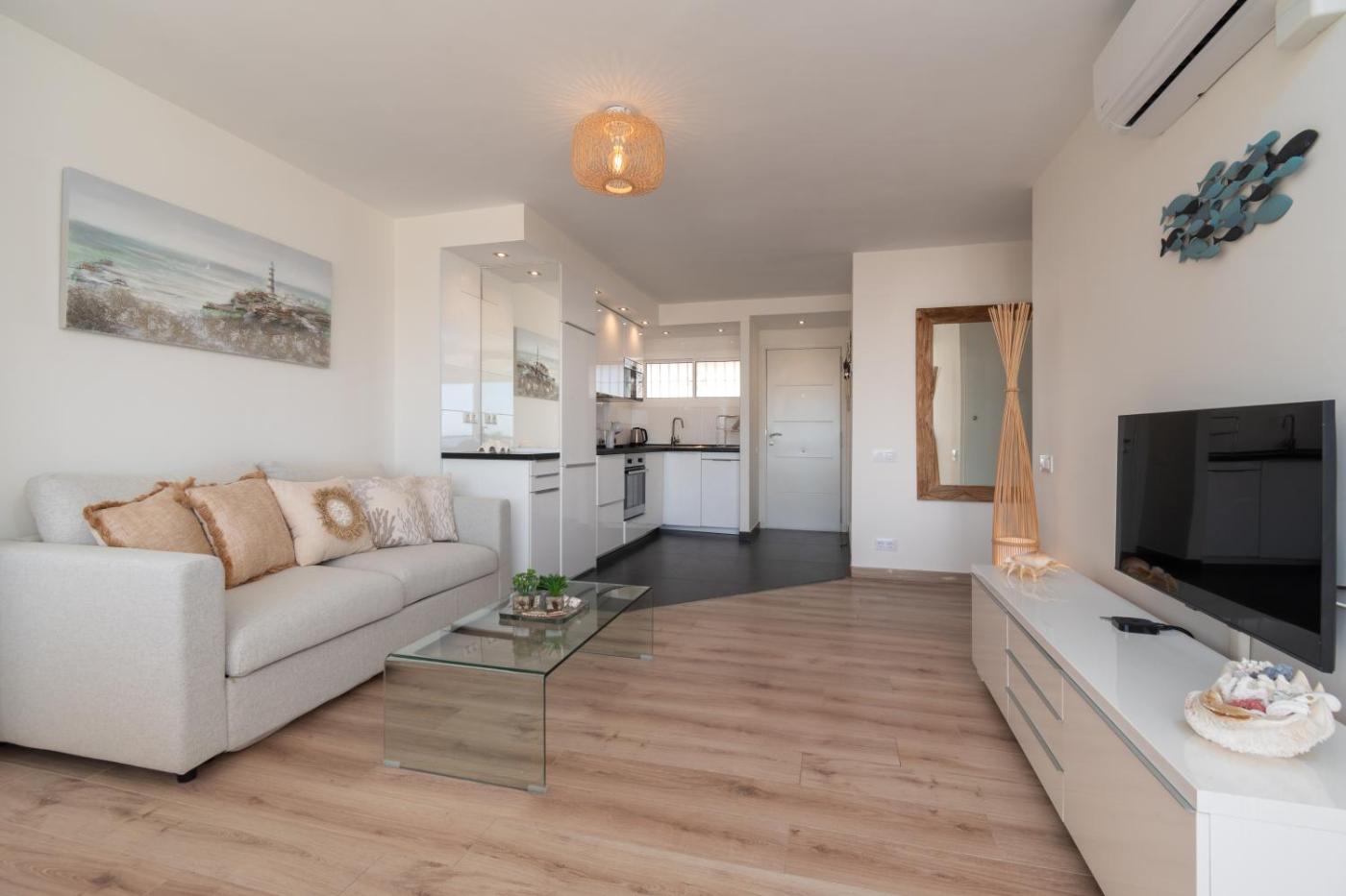 Luxury Frontline beach apartment with sea view, que tiene vistas al mar, ofrece alojamiento con balcón y hervidor, y está a unos 3 min a pie de Playa de Santa Ana. Este apartamento tiene piscina privada, jardín y parking privado gratis.